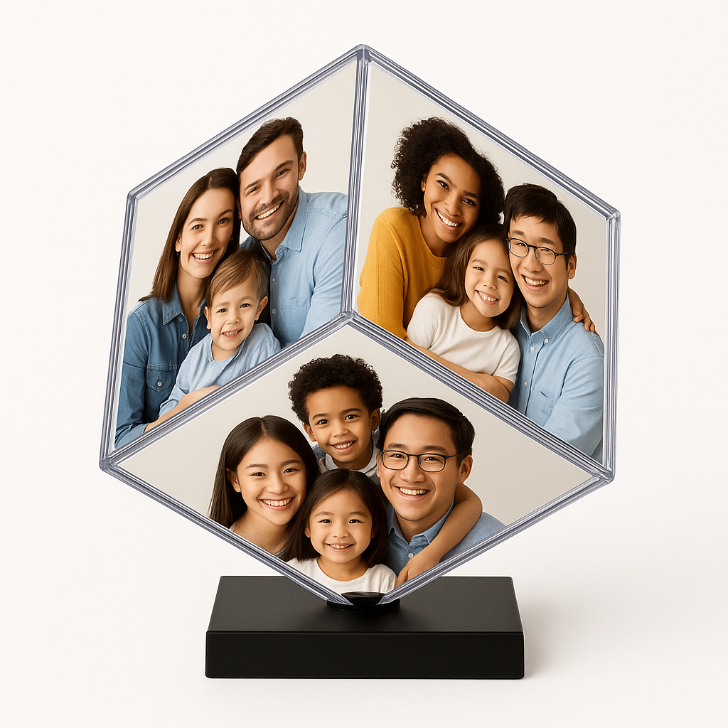 Cubo de Fotos Giratório de Acrílico – Para até 6 Fotos, com Base Giratória – 6,2 cm